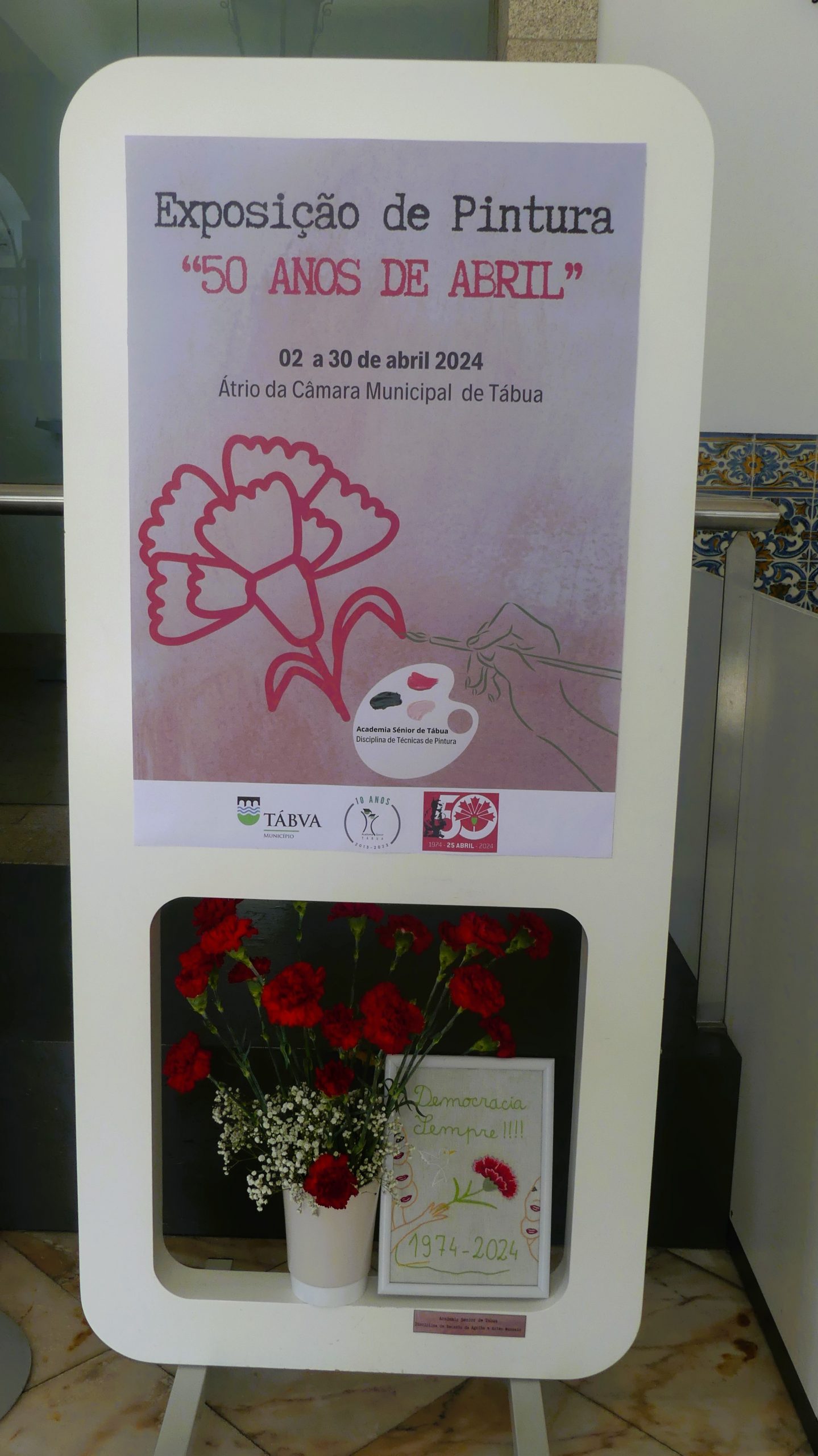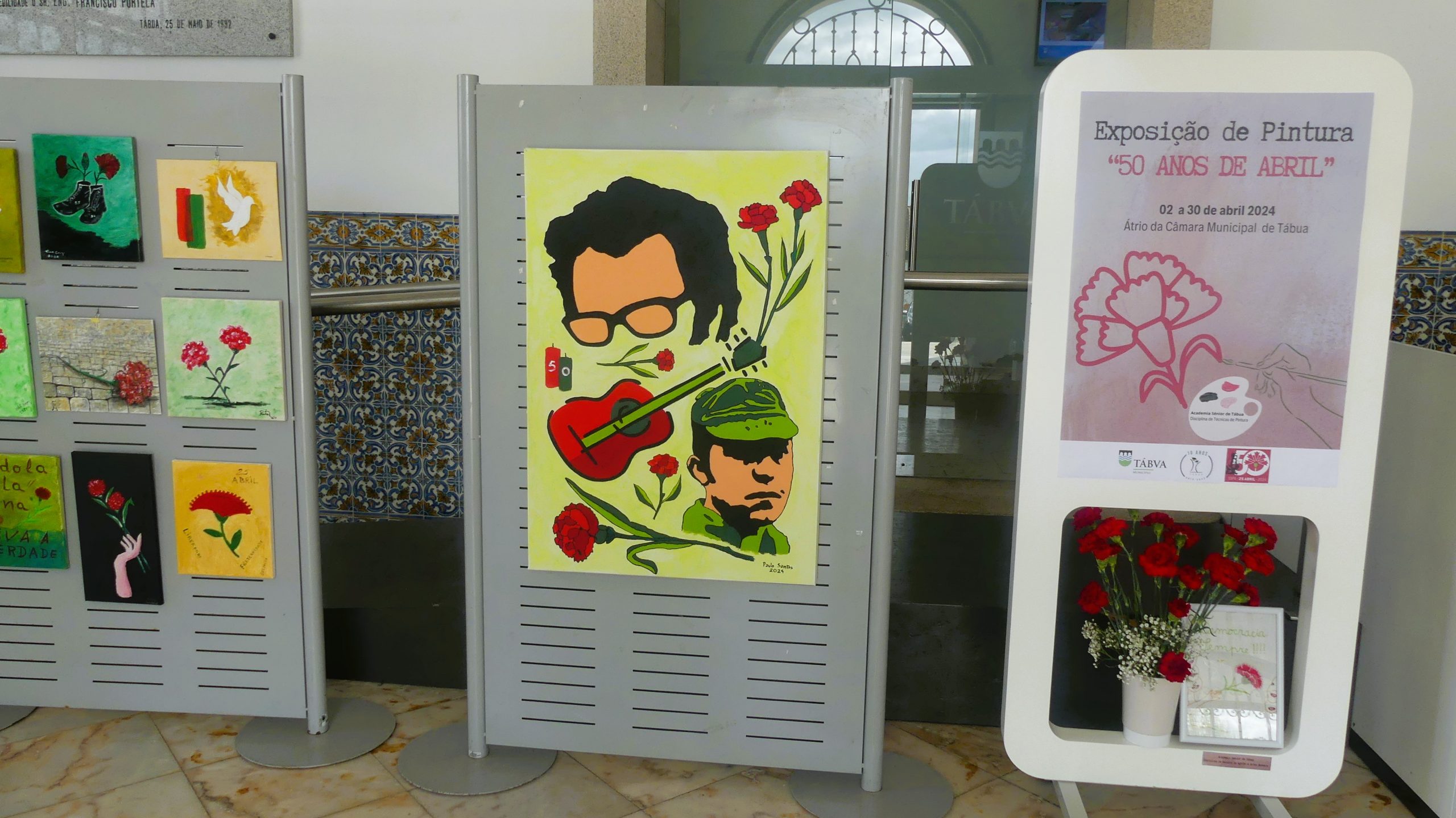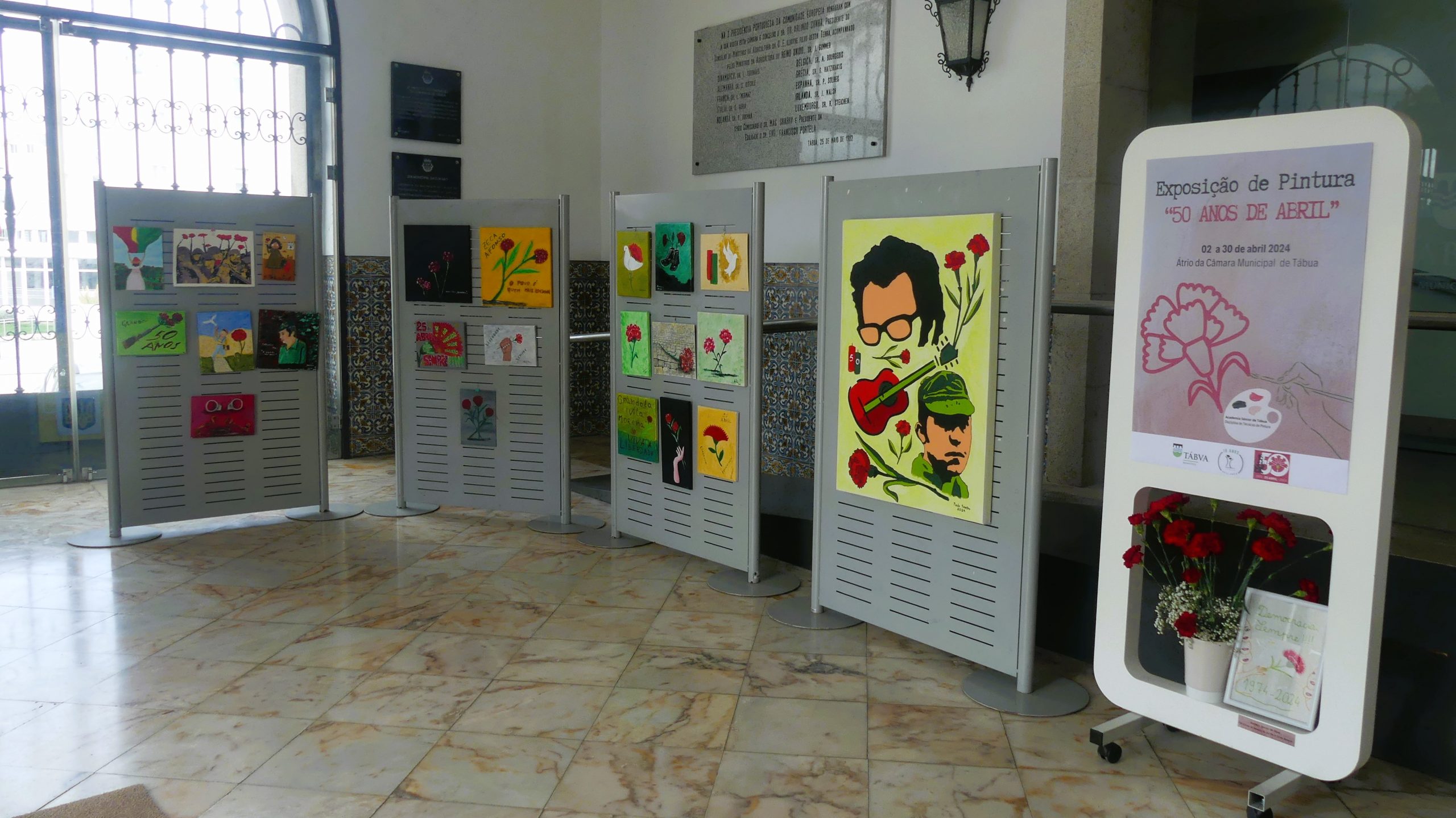 No passado dia 2 de abril, pelas 14h30, foi inaugurada no átrio da Câmara Municipal a tão aguardada inauguração da exposição de pintura "50 Anos de Abril", da Academia Sénior de Tábua. Esta iniciativa, integrada nas celebrações do 50º aniversário do 25 de Abril, reuniu uma seleção de obras realizadas pelos alunos da disciplina de Técnicas de Pintura. O evento contou com a presença ilustre do Presidente da Câmara Municipal, Ricardo Cruz, do Vice-presidente, António Oliveira, do Vereador David Pinto e da Coordenadora da Academia Sénior de Tábua, Paula Duarte. Um dos momentos marcantes da inauguração foi a oferta de um quadro alusivo ao 25 de abril pelo professor da disciplina, Paulo Santos, ao Município. Esta peça, que agora integra a exposição, representa um tributo à história e aos ideais da Revolução dos Cravos. Além das obras dos alunos de Técnicas de Pintura, a exposição também destacou um quadro elaborado pelas alunas da disciplina "Recanto da Agulha e Artes Manuais", evidenciando a diversidade de talentos e habilidades presentes na Academia Sénior de Tábua. A exposição "50 Anos de Abril" permanecerá no átrio da autarquia até ao final do mês, proporcionando a todos os visitantes a oportunidade de apreciar e refletir sobre o legado e os valores do 25 de Abril de 1974, que continuam a inspirar gerações.